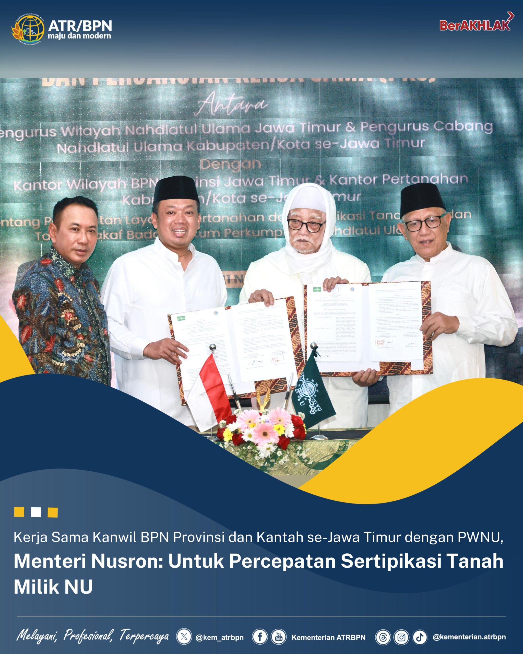 Di kesempatan ini, juga dilakukan penandatanganan Perjanjian Kerja Sama (PKS) antara Kantor Pertanahan (Kantah) dengan Pengurus Cabang Nahdlatul Ulama (PCNU) se-Provinsi Jawa Timur. (red.)