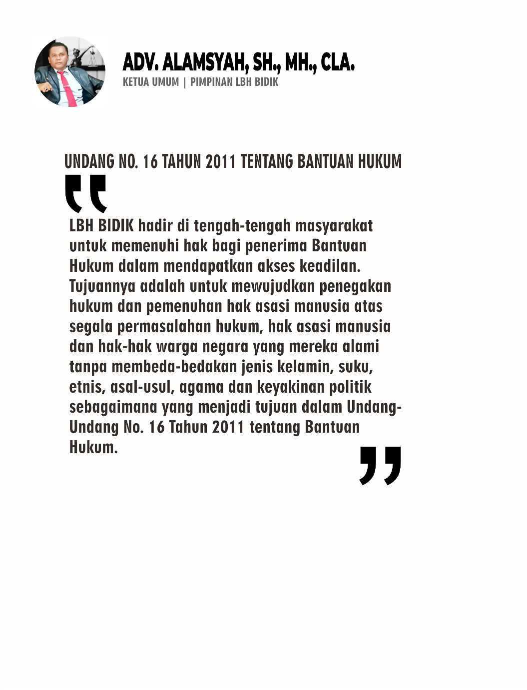 Dibawah naungan Yayasan Lembaga Bantuan Hukum BIDIK, di LBH BIDIK terdapat 3 (tiga) Bidang Pelayanan Pemberian Bantuan Hukum yaitu Bidang Litigasi, Bidang Non Litigasi dan Bidang Pelatihan dan Penyuluhan Hukum.