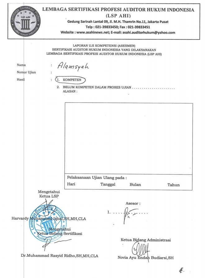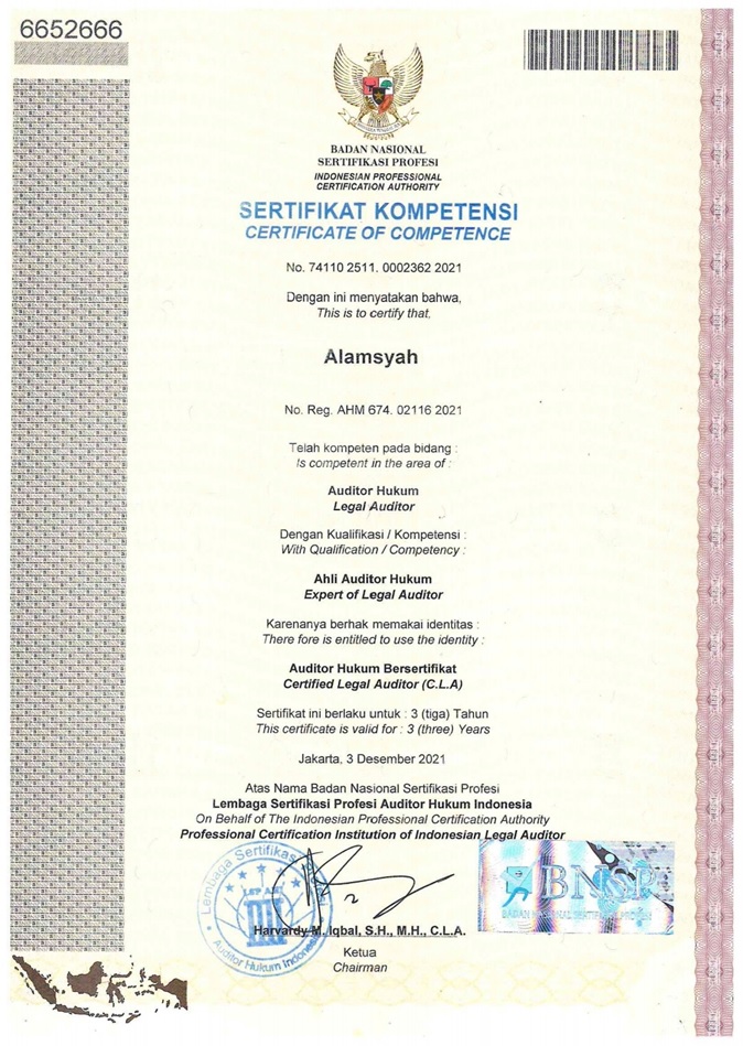 d. Lulus Uji Kompetensi Sebagai Auditor Hukum Indonesia yang diselenggarakan oleh Asosiasi Auditor Hukum Indonesia (ASAHI)
