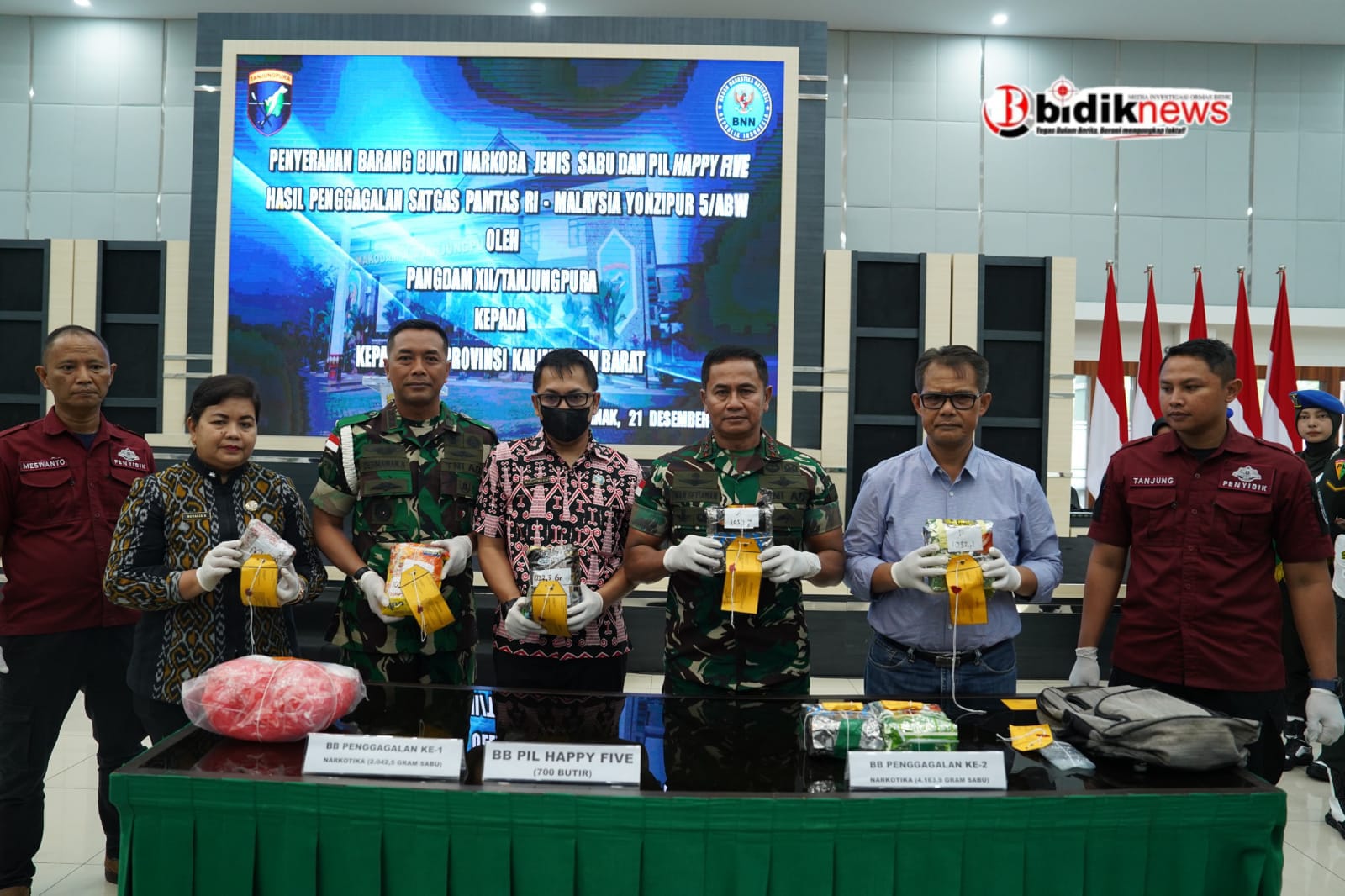 Adapun barang bukti Narkoba yang diserahkan berupa sabu 6.206,4 Gram dan Pil Happy Five sebanyak 70 strip(700) butir.Narkoba tersebut merupakan hasil penggagalan dari Satgas Pamtas RI-Malaysia Batalyon Zipur 5/ABW di wilayah perbatasan.