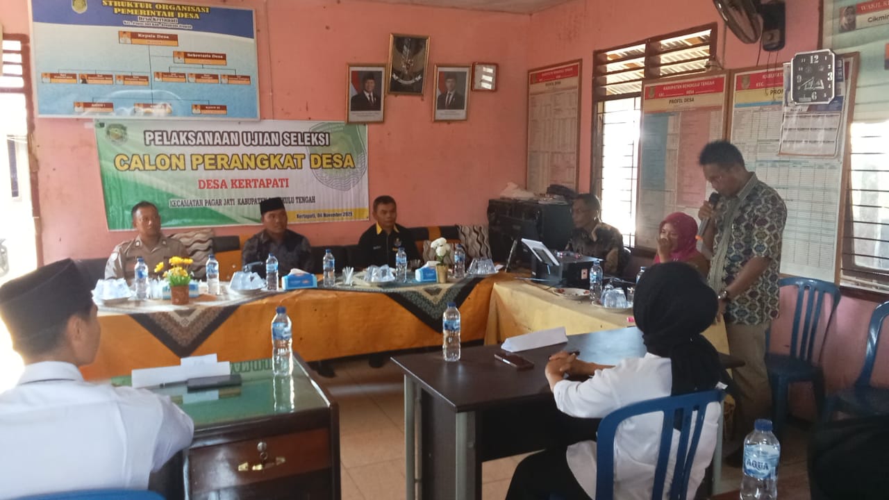 BIDIKNEWS-INDONESIA, Lintas Daerah, Pemerintah Desa Kertapati Kecamatan Pagar Jati Kabupaten Bengkulu Tengah menggelar seleksi pergantian Perangkat Desa. Seleksi Perangkat Desa tersebut diikuti sebanyak 4 peserta berlangsung di Kantor Desa Kertapati. Selasa (04/11/2025).