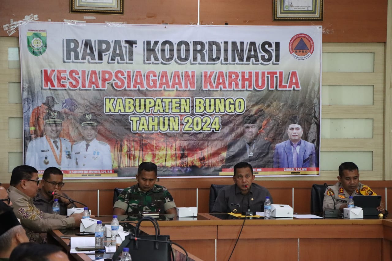Kegiatan Rakor Karhutla tersebut dipimpin Wakil Bupati Bungo H. Safrudin Dwi Aprianto, S. Pd, M.M, yang didampingi oleh Kapolres Bungo AKBP Natalena Eko Cahyono, Dandim 0416 Bute Letkol Info Arief Widyanto SE,M.Han serta dihadiri Oleh Ketua Pengadilan Negeri Muara Bungo Bayu Agung Kurniawan SH, Perwakilan Kajari Muara Bungo, Sekda Kab. Bungo Drs. Mursidi, Asisten I Setda Kab. Bungo Ana Lukita, Kabag Ops Polres Bungo Kompol H. Darmawan SH, Kasat Intelkam AKP Tarjono SH.,MH, Danramil Muara Bungo Kapten Abasri, Kaban BPBD Kesbangpol Zainadi, Kepala OPD Kab. Bungo, Para Camat Se Kab. Bungo.