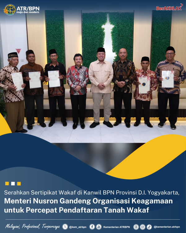 BIDIKNEWS-INDONESIA | Nasional, D. I. Yogyakarta – Menteri Agraria dan Tata Ruang/Kepala Badan Pertanahan Nasional (ATR/BPN), Nusron Wahid menyatakan bahwa Kementerian ATR/BPN tengah mempercepat pendaftaran seluruh tanah wakaf yang ada di Indonesia. Komitmen itu ia sampaikan ketika menyerahkan sertipikat tanah wakaf di Kantor Wilayah (Kanwil) BPN Provinsi D. I. Yogyakarta, Selasa (17/12/2024).